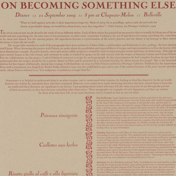 In "Red," Niama Safia Sandy writes about her personal and familial connections to sorrel, a drink she learned to make from her mother, with ties that criss-cross the Black Atlantic. Food as legacy and memoir also runs through our interview with Danielle Elizabeth Stevens, who speaks lovingly about her grandmother's impact on her approach to food as she details what moved her to start the initiative #WeStillGottaEat, which offers free healthy meals to Black Angelenos. That spirit of radical generosity also informs the work of late artist Felix Gonzalez-Torres, whose "Untitled" (Fortune Cookie Corner) manifested this spring and summer in an exhibition comprising hundreds of piles of cookies around the globe; Kavior Moon reports from one of those sites, at the LA restaurant Porridge + Puffs, where fortunes that invoke home-building especially resonate. And finally, Jonathan Griffin remembers Tina Girouard, an artist indelibly associated with the restaurant FOOD, an essential spot for the 1970s Downtown New York scene, who died in April.