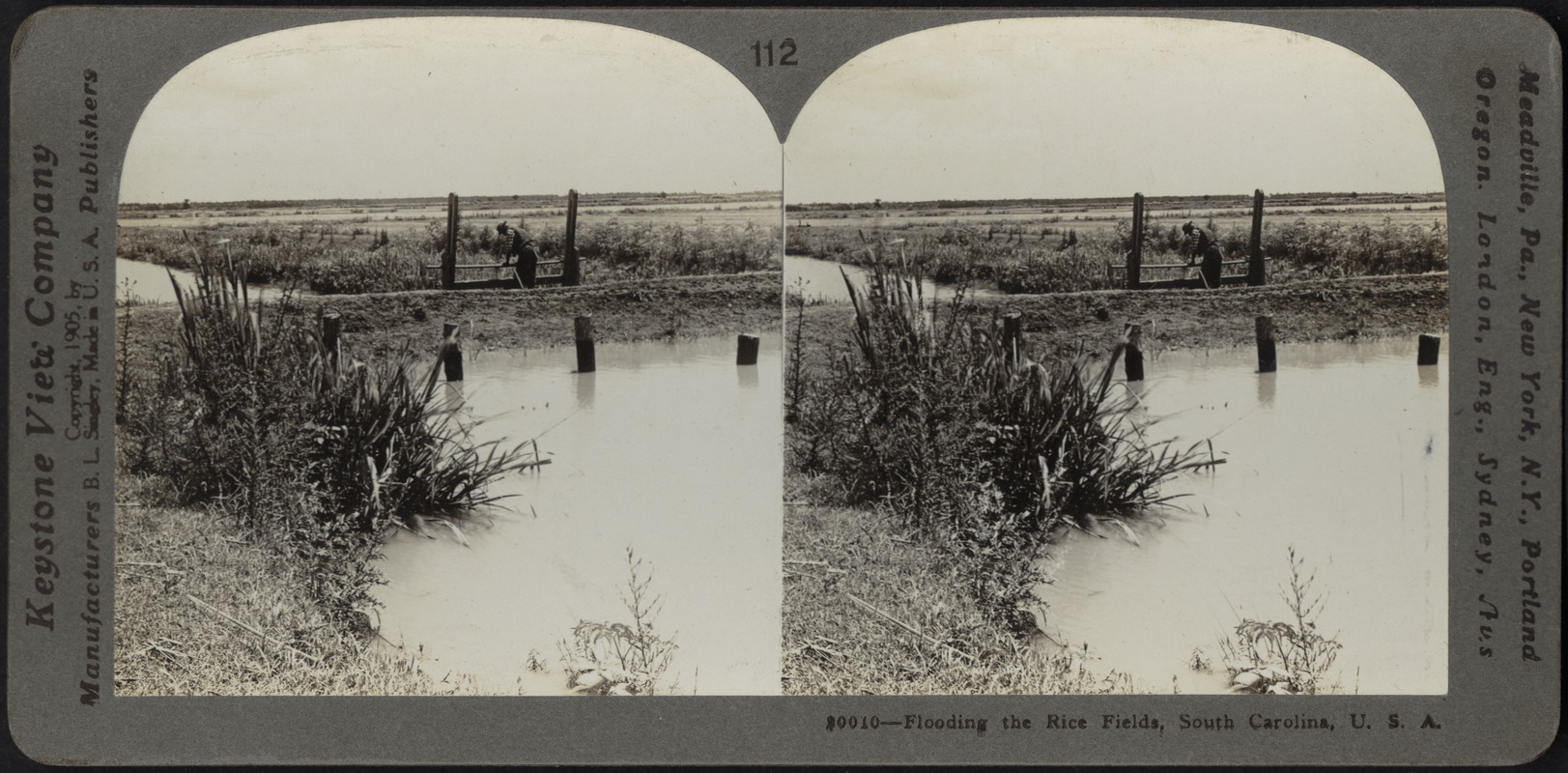 Images: Flooding Rice Fields, South Carolina, photographic print of flooded rice fields on a curved stereo card, with accompanying text describing this process, 9 x 18 cm. Collection of the Boston Public Library, Courtesy of Digital Commonwealth.
